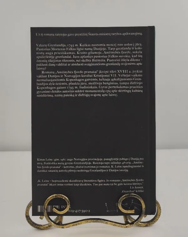 Už šį romaną rašytojas gavo prestižinį Šiaurės ministrų tarybos apdovanojimą. Vakarų Grenlandija 1793 m. Kažkas nustumia moterį nuo uolos į jūrą. Pastorius Mortenas Falkas ilgisi namų Danijoje. Tarp grenlandų ir kolonistų auga priešiškumas. Krašto gilumoje, Amžinybės fjorde, sukyla apsikrikštiję  grenlandai. Juos aplankęs pastorius Falkas suvokia, kad šių žmonių tikėjimas tikresnis, nei skelbia Bažnyčia. Pastoriui iškyla dilema – paklusti danų valdžiai ar atsiduoti svaiginančioms grenlandų svajonėms apie laisvę? Romaną „Amžinybės fjordo pranašai“ įkvėpė tikri XVIII a. įvykiai valdant Danijos ir Norvegijos karaliui Kristijonui VII. Veikėjai vaikšto šurmuliuojančiomis Kopenhagos gatvėmis, keliauja apledėjusiomis Grenlandijos dykvietėmis, plaukia jūra, medžioja banginius, tampa didžiojo Kopenhagos gaisro 1795 m. liudininkais. Gyvai perteikdamas praeities gyvenimo detales autorius sukuria monumentalų epą apie skirtingų kultūrų susidūrimą, namų paiešką ir didžiąją svajonę apie laisvę. Rašytojas Kimas Leine (gim. 1961) augo Norvegijos provincijoje, paauglystėje pabėgo į Daniją pas tėvą. Penkiolika metų gyveno Grenlandijoje. Rašytoju tapo sulaukęs 46-erių. „Amžinybės fjordo pranašai“ – ketvirtas, plačiai įvertintas jo romanas. K. Leine įspūdingiausiai iš daniškai rašančių autorių plėtoja sudėtingą Grenlandijos ir Danijos istoriją. K. Leine – beprecedentė skandinavų literatūros figūra. Jo romanas „Amžinybės fjordo pranašai“ iškart imtas vertinti kaip klasikinis. Tuo pat metu tai be galo keistas kūrinys. Liz Jensen, „Guardian“ kritikė Vertėja: Ieva Toleikytė