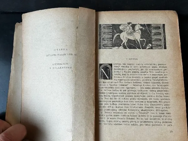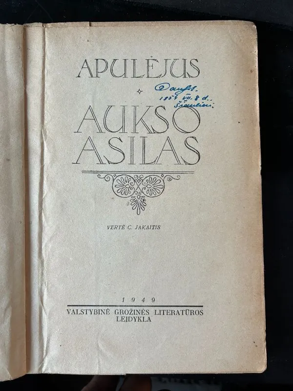 Romanas Metamorfozės (vėlesnis pavadinimas Aukso asilas, lietuvių kalba 1949, 1987). Romano pagrindinis veikėjas mėgsta žemiškuosius malonumus ir užsiiminėja magija. Pavirtęs asilu ir patyręs daug kan...