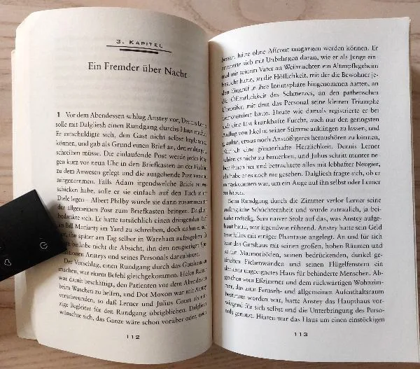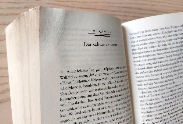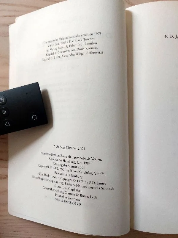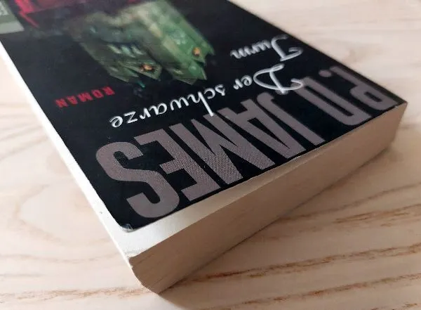 (Knygos viršuje lapai lengvai pasibangavę. Minkšto viršelio nugarėlė pasilenkus nuo skaitymo, pasidėvėję viršelio kampeliai. P. J. James (vokiečių kalba) turiu šias knygas: Ein unverhofftes Geständnis; Der schwarze Turm; Ein makelloser Tod.)