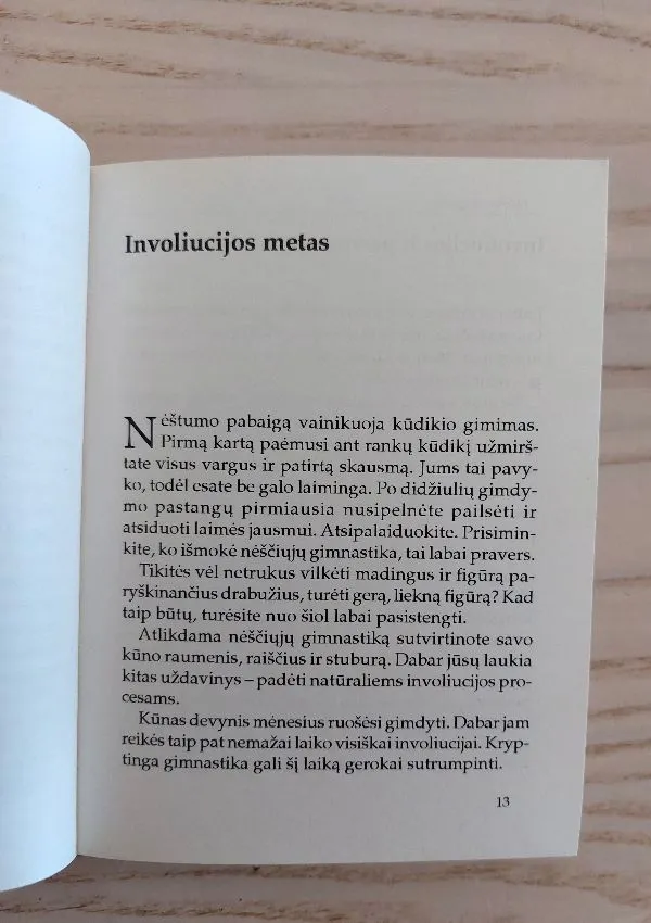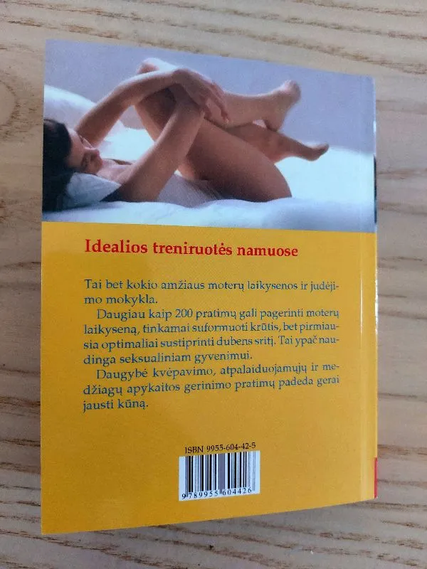 "Idealios treniruotės namuose" - tai bet kokio amžiaus moterų laikysenos ir judėjimo mokykla. Daugiau kaip 200 pratimų gali pagerinti moterų laikyseną, tinkamai suformuoti krūtis, bet pirmiausia optimaliai sustiprinti dubens sritį. Tai ypač naudinga seksualiniam gyvenimui. Daugybė kvėpavimo, atpalaiduojamųjų ir medžiagų apykaitos gerinimo pratimų padeda gerai jausti kūną. TurinysApie šią knygą Involiucijos metas Involiucijos ir persitvarkymo procesai Gimdos involiucija Ankstyvasis pogimdyminis laikotarpis Vidurinis pogimdyminis laikotarpis Vėlyvasis pogimdyminis laikotarpis Priežiūros patarimai Krūtų priežiūra Gulėjimas ir judėjimas Kasdienė laikysena Laikysenos lavinimas Pogimdyminis laikotarpis ir involiucinė gimnastika Pratimų programos sudarymas Medžiagų apykaitos pratimai Plaštakos ir rankos Pėdos ir kojos Pasirengimas stiprinamiesiems pratimams Dubens dugno sandara ir funkcija Dubens dugno suvokimas Atpalaiduojamieji ir kvėpavimo pratimai Dubens dugno pratimai Kegelio pratimas Pirmasis pratimų kompleksas Antrasis pratimų kompleksas 68 Dubens dugno ir įstrižųjų pilvo raumenų pratimai Padėtis ant nugaros Padėtis ant nugaros aukštai pakėlus blauzdas Sėdint Keturpėsčia Judant Su kūdikiu Pratimai, apsaugantys nuo gimdos ir vidaus organų nusileidimo Pilvo ir nugaros raumenų pratimai Pratimai visam kūnui įtempti Krūtinės raumenų pratimai Priedas Literatūra Dalykinė rodyklė