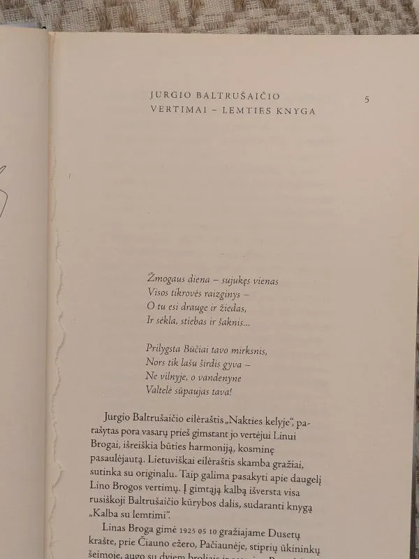 Pirmą kartą Lietuvoje viena knyga išleidžiami poeto, vertėjo, diplomato Jurgio Baltrušaičio (1873–1944) rusiškosios poezijos vertimai į lietuvių kalbą. Didžiąją gyvenimo dalį praleidęs Rusijoje, kūręs lietuvių ir rusų kalbomis, išpažinęs simbolizmo estetiką poetas filosofiškai apmąstė žmogaus būtį, jo vietą visatos sandaroje, tos būties dramatiškumą, ir drauge viltingai tikėjo pasaulio harmonija. Į knygą „Kalba su lemtimi“ sudėti įvairūs rinkiniai, taip pat į rinkinius neįėję bei iš autoriaus archyvo Paryžiuje Laimono Tapino parvežti eilėraščiai. Vertė Linas Broga (1926–2005).