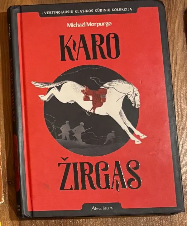 Jaunimui nuo 12 m.  Nuoširdus ir jaudinantis žirgo Džojaus pasakojimas skaitytoją nukelia į Pirmojo pasaulinio karo metus. Džojus – stiprus ir laimingas penkiolikmečio Alberto numylėtinis, parduodamas karininkui ir patenka į Vakarų frontą. Čia kiekviename žingsnyje tyko pavojai ir vienas po kito mūšio lauke krinta žmonės bei arkliai, o Džojaus jėgos irgi pamažu senka. Albertas yra prisiekęs padaryti viską, kad surastų savo žirgą, tik ar karo sūkuryje tai įmanoma? Nepaprasta istorija apie tikrą draugystę ir nesumeluotą gerumą bei kilnumą, kuris įmanomas net karo beprotybėje. Michael Morpurgo (g. 1943) – talentingas britų vaikų literatūros kūrėjas, daugiau nei šimto knygų autorius, išgarsėjęs jautriomis istorijomis apie gyvūnus. Į lietuvių kalbą išversta ir daugiau jo knygų: „Gimęs bėgti“, „Kasparas, kačių princas“ bei „Baltasis liūtas“. Pirmą kartą 1982 m. pasirodęs „Karo žirgas“ yra vienas reikšmingiausių autoriaus kūrinių, pagal kurį garsus Holivudo režisierius Stevenas Spielbergas sukūrė kino filmą. Šis kūrinys įeina į leidyklos „Alma littera“ leidžiamą vertingiausių klasikos kūrinių kolekciją. Ją sudaro reikšmingiausi ir vertingiausi kūriniai – nuo laiko išbandymą įveikusios klasikos iki šiuolaikinių kūrinių, jau tapusių moderniąja klasika.