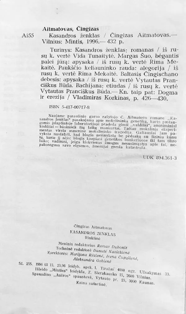 Pasaulinio garso rašytojo romane "Kasandros ženklas" pasakojama apie mokslininką genetiką, kurio pastangomis įslaptintoje laboratorijoje pradeda gimti "valdiški", anoniminiai kūdikiai-būsimieji šių laikų mankurtai. Tačiau mokslinis eksperimentas virsta asmenine mokslininko tragedija. Galiausiai jam pavyksta nustatyti, kad blogis neišnyksta be pėdsakų su fiziniu kūnu tų, kurie jį sėjo: blogis kaupiasi genetikos bunkeriuose iki tam tikro laiko; vadinasi, jeigu kiekvienas žmogus nesusimąstys apie tai, nepakoreguos savo elgsenos, žmonijai gresia katastrofa.
