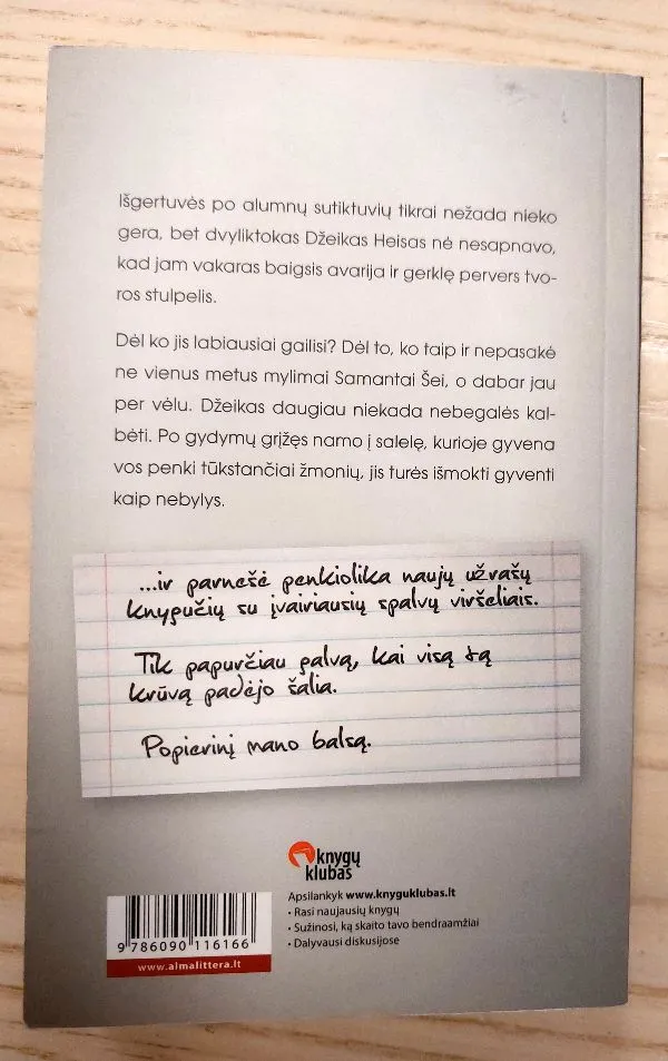 Apsvaigęs nuo alkoholio ir draugų padrąsintas Džeikas Heisas pagaliau ryžosi prisipažinti meilę ne vienus metus mylimai Samantai Šei, bet jis nė nenumanė, kad smagus vakaras baigsis avarija, po kurios jis daugiau niekada negalės kalbėti. Grįžęs namo į salelę, kurioje gyvena vos penki tūkstančiai žmonių, Džeikas turės išmokti gyventi kaip nebylys. Jis pamatys, kad šeima – tai ne vien šešetas brolių ir seserų, kartais tavimi rūpinasi visa sala. O praleidęs daugiau laiko su Samanta, suvoks, kad kalbos netekimas dar nėra pati baisiausia tragedija. Galbūt, jei tik ji leis, Džeikas, net ir praradęs kalbos dovaną, galų gale pasakys tai, ko nespėjo ištarti anksčiau. Dėl ko jis labiausiai gailisi? Dėl to, ko taip ir nepasakė ne vienus metus mylimai Samantai Šei, o dabar jau per vėlu. Džeikas daugiau niekada nebegalės kalbėti. Po gydymų grįžęs namo į salelę, kurioje gyvena vos penki tūkstančiai žmonių, jis turės išmokti gyventi kaip nebylys.
