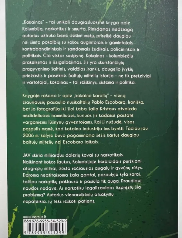 „Kokainas“ – tai unikali daugiasluoksnė knyga apie Kolumbiją, narkotikus ir smurtą. Rinkdamas medžiagą autorius užtruko bene dešimt metų, prireikė daugiau nei šimto pokalbių su kokos augintojais ir ga...