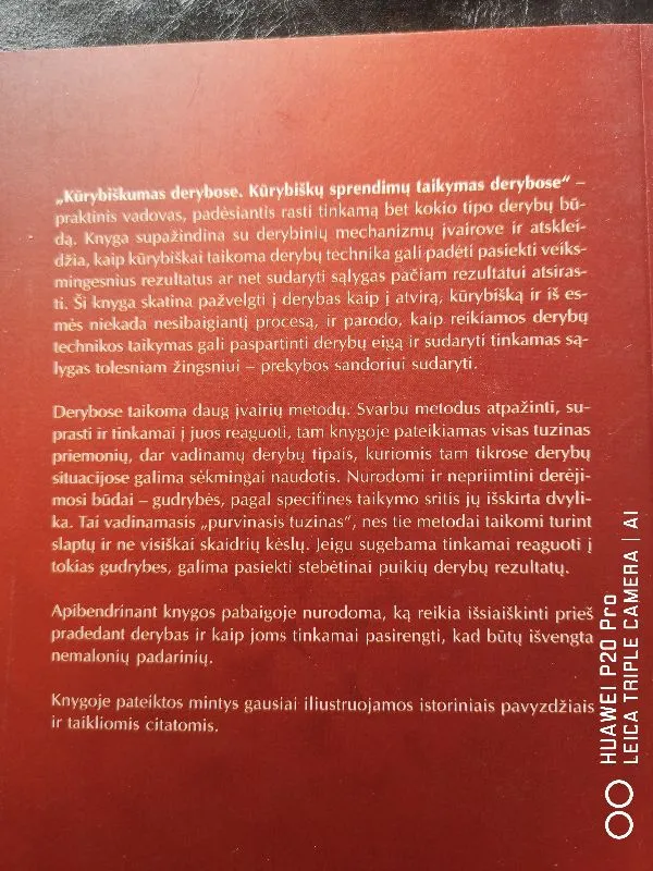 Kūrybiškumas derybose : kūrybiškų sprendimų taikymas derybose” – praktinis vadovas, padėsiantis rasti tinkamą bet kokio tipo derybų būdą. Knyga supažindina su derybinių mechanizmų įvairove ir atskleidžia, kaip kūrybiškai taikoma derybų technika gali padėti pasiekti veiksmingesnius rezultatus ar net sudaryti sąlygas pačiam rezultatui atsirasti. Ši knyga skatina pažvelgti į derybas per atvirą, kūrybišką ir iš esmės niekada nesibaigiantį procesą, ir parodo, kaip reikiamos derybų technikos taikymas gali paspartinti derybų eigą ir sudaryti tinkamas sąlygas tolesniam žingsniui – prekybos sandoriui sudaryti.
