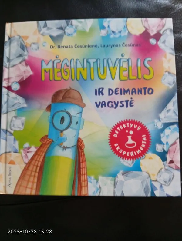 Mėgintuvėliui ir jo kolegoms mokslininkams patikėta svarbi užduotis – nugabenti sukurtą deimantą į Kauno laboratoriją. Tačiau kelionėje atsitiko baisus dalykas! DEIMANTAS DINGO! Ar jis iškrito? O gal piktadariai pavogė? Į pagalbą ištirti šio įvykio atskubėjo Kolbutė. Atversk šią knygą ir kartu su Kolbute bei mokslininkais ištirk šį paslaptingą įvykį. Tapk tikru detektyvu! Taip pat... Sužinok, kaip matuojami brangakmeniai, kas yra briliantas, kuo ypatingi pirštų atspaudai. Išmok paslėpti monetą stiklinėje, išsaugoti pirštų atspaudus, rašyti slaptu kodu ir kitų gudrybių.