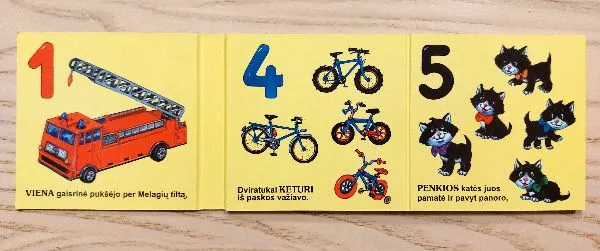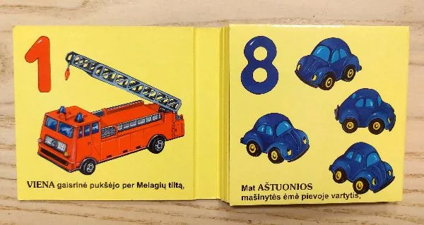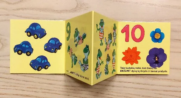 Mažo formato (10 x 10,5 cm) knygelė vaikams mokytis skaičiuoti iki dešimties. Kieti puslapiai. Knygelė išsilanksto ir susilanksto.