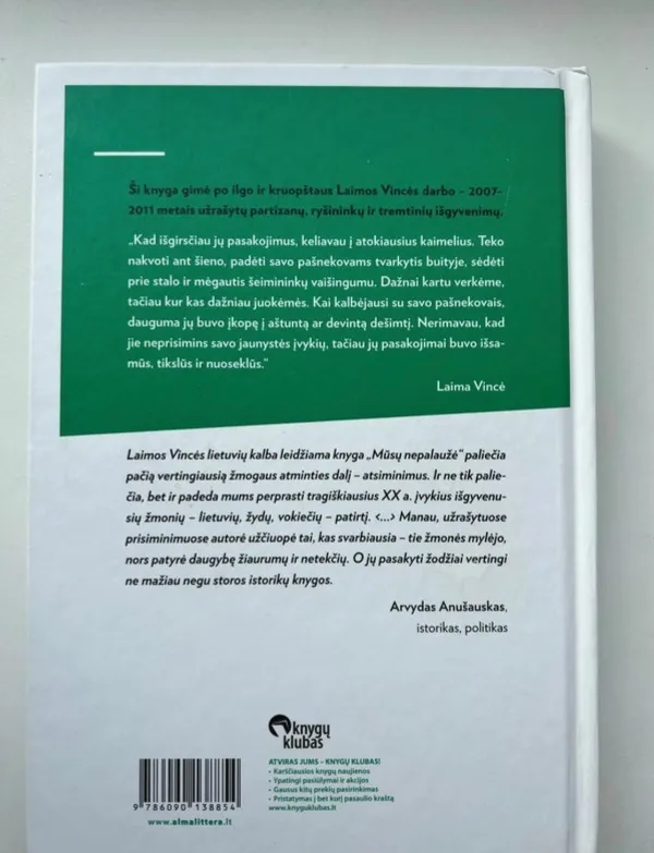 Ši knyga gimė po ilgo ir kruopštaus Laimos Vincės darbo – 2007–2011 metais užrašytų partizanų, ryšininkų ir tremtinių išgyvenimų.„Kad išgirsčiau jų pasakojimus, keliavau į atokiausius kaimelius. Teko nakvoti ant šieno, padėti savo pašnekovams tvarkytis buityje, sėdėti prie stalo ir mėgautis šeimininkų vaišingumu. Dažnai kartu verkėme, tačiau kur kas dažniau juokėmės. Kai kalbėjausi su savo pašnekovais, dauguma jų buvo įkopę į aštuntą ar devintą dešimtį. Nerimavau, kad jie neprisimins savo jaunystės įvykių, tačiau jų pasakojimai buvo išsamūs, tikslūs ir nuoseklūs.“Laima Vincė„Laimos Vincės lietuvių kalba leidžiama knyga „Mūsų nepalaužė“ paliečia pačią vertingiausią žmogaus atminties dalį – atsiminimus. Ir ne tik paliečia, bet ir padeda mums perprasti tragiškiausius XX a. įvykius išgyvenusių žmonių – lietuvių, žydų, vokiečių – patirtį. <...> Manau, užrašytuose prisiminimuose autorė užčiuopė tai, kas svarbiausia – tie žmonės mylėjo, nors patyrė daugybę žiaurumų ir netekčių. O jų pasakyti žodžiai vertingi ne mažiau negu storos istorikų knygos.“Arvydas Anušauskas, istorikas, politikasLaima Vincė – rašytoja, dramaturgė, poetė, vertėja, dėstytoja. Ji įgijo kūrybinio rašymo literatūros magistro laipsnį Kolumbijos universiteto meno mokykloje ir negrožinės literatūros magistro laipsnį Naujojo Hampšyro universitete. Laima Vincė yra gavusi dvi Fulbright kūrybinio rašymo stipendijas, Nacionalinio fondo literatūros meno premiją bei PEN vertimų fondo dotaciją. Parašė romaną This is Not My Sky („Tai ne mano dangus“) ir šešias negrožinės literatūros knygas: Lenin‘s Head on a Platter („Lenino galva ant padėklo“), Journey into the Backwaters of the Heart („Mūsų nepalaužė“), The Snake in the Vodka Bottle („Gyvatė degtinės butelyje“), Digging a Hole to China: A Memoir on Teaching and Traveling („Tunelis į Kiniją: Prisiminimai apie mokymą ir keliones“), The Way Life Should Be („Koks turėtų būti gyvenimas“).