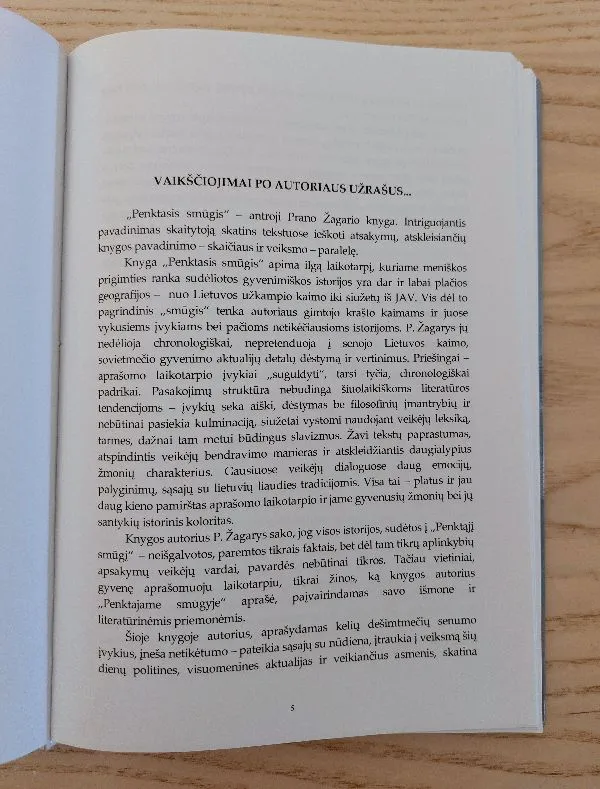 „Penktasis smūgis“ - esė rinkinys. Daugumos jų personažai ir vietovės pasakojant pridengiami išgalvotais vardais, tačiau visi nutikimai yra tikrų autoriaus išgyventų įvykių aidas, nuolat papildomas pamąstymais, tiesiančiais tiltus tarp įvairių laikmečių ir pasakotojo šiuolaikinio gyvenimo suvokimo.