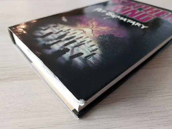(Pasilankstę, pasidėvėję popierinio aplanko krašteliai, kampeliai. Pirmasis priešlapis apačioje įplyšęs, bet suklijuotas siaura izoliacijos juostele. Lapai nuo laiko šiek tiek patamsėję. Užvertus knygą, jos viršuje, šone ir apačioje matomos dėmės. Juodas kietas viršelis šiek tiek pablukęs. Turiu šias Stephen King knygas: The Green Mile, Pet Sematary, Doctor Sleep)