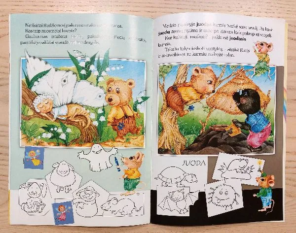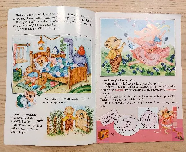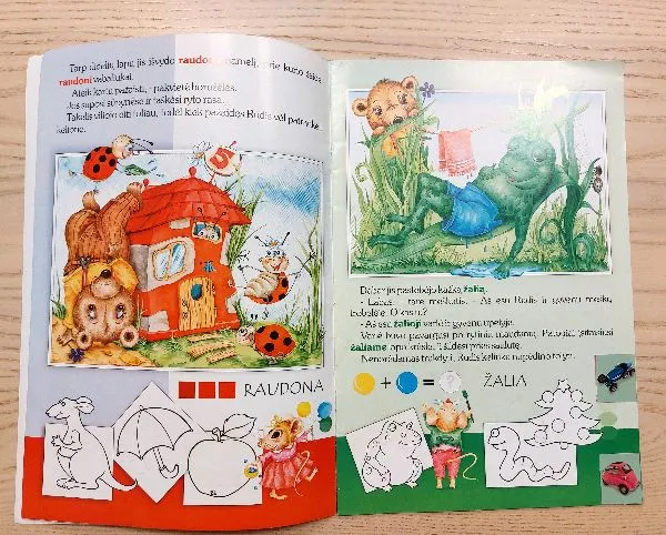 (Lipdukai prilipinti. Nuspalvinti viename puslapyje esantys paršelis ir laikrodukas. Likę paveikslėliai nenuspalvinti)