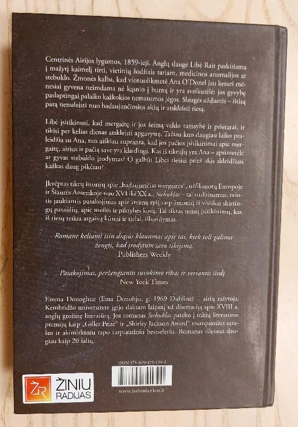 Libė įsitikinusi, kad mergaitę ir jos šeimą valdo tamsybė ir prietarai, ir tikisi per kelias dienas atskleisti apgavystę. Tačiau kuo daugiau laiko praleidžia su Ana, tuo aiškiau supranta, kad jos pačios įsitikinimai apie mergaitę, airius ir pačią save yra klaidingi. Kas iš tikrųjų yra Ana – apsimetėlė ar gyvas stebuklo įrodymas? O galbūt Libei tiesiai prieš akis skleidžiasi kažkas daug pikčiau? Įkvėptas tikrų istorijų apie „badaujančias mergaites“, užfiksuotų Europoje ir Šiaurės Amerikoje nuo XVI iki XX a., „Stebuklas“ – tai stulbinamas, mintis jaukiantis pasakojimas apie artimą ryšį tarp žmonių iš visiškai skirtingų pasaulių, apie meilės ir piktybės kovą. Tai tikras mūsų įsitikinimų, kas iš tiesų teikia atgaivą kūnui ir sielai, išbandymas. „Kibirkščiuojančios įtampos istorinis romanas apie galią naikinti.“Stephen King „Romane keliami itin drąsūs klausimai apie tai, kiek toli galima žengti, kad įrodytum savo tikėjimą.“Publishers Weekly „Pasakojimas, peržengiantis suvokimo ribas ir veriantis širdį.“New York Times Shirley Jackson Award“ trumpuosius sąrašus ir akimirksniu