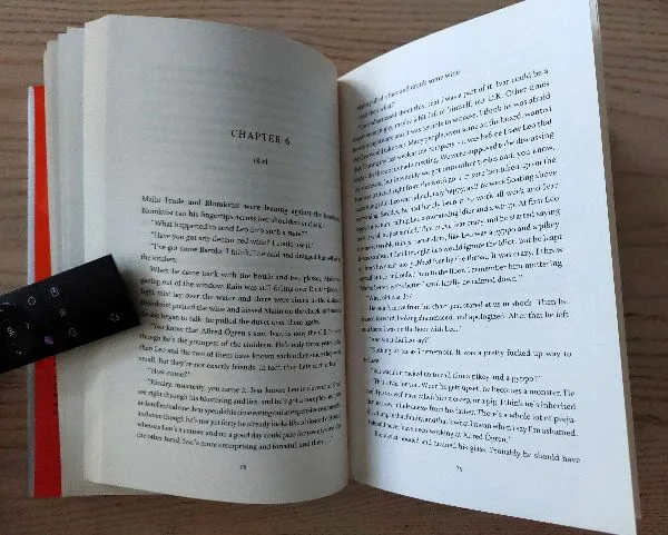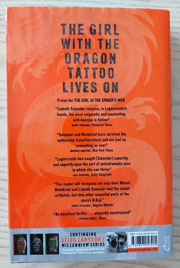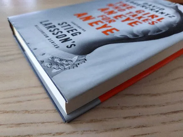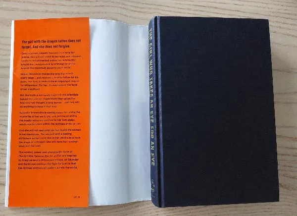 (Užvertus knygą, jos viršuje ir apačioje matomas neryškus gelstelėjimas. Millennium turiu šias knygas: The Girl with the Dragon Tattoo, The Girl Who Takes an Eye for an Eye, The Girl in the Spider’s Web.)