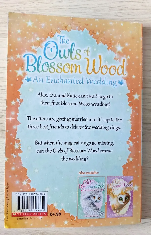 An Enchanted Wedding (2016): Katie, Eva and Alex know a secret - when they hide inside a hollow tree trunk at the bottom of Katie's garden, they find themselves whisked away to a magical woods alive with animals, where they're no longer girls but owls! The friends are back and the otters of Willow Lake are getting married! The owls are so excited to be invited to the wedding, and volunteer to help with the preparations. But there's a problem when the special wedding reeds go missing - the otters can't get married without them. Katie, Alex and Eva are determined to find them, but they only have a few hours, and there's the whole of Blossom Wood to search!