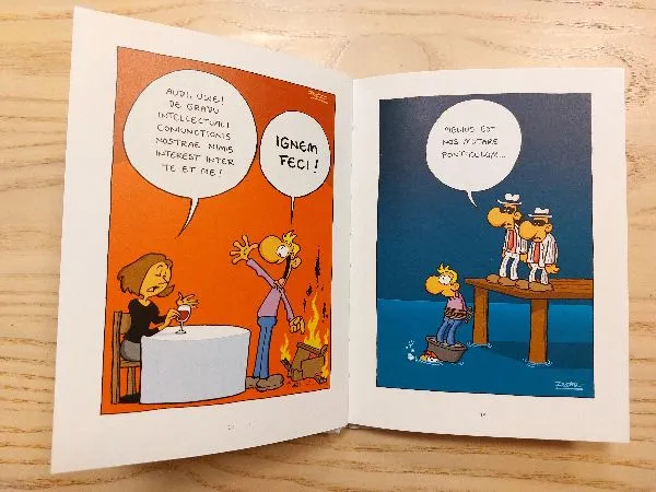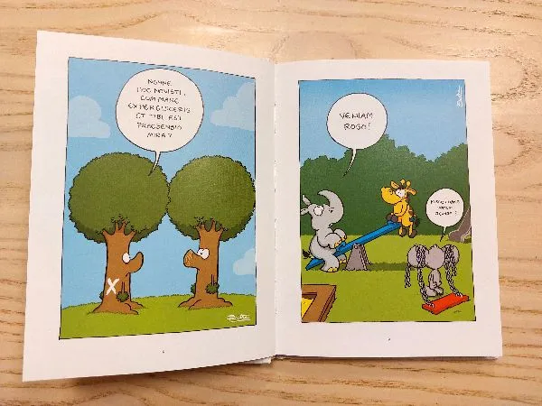 Autoriai pirmą kartą pristato savo karikatūras lotynų kalba. Nesvarbu, ar tai būtų apie laikrodžius-radijus, šaltkalvius ar laiko mašinas – trijulė parodo, kas nutinka, kai senovės lingvistinis menas susiduria su šiuolaikiniais absurdais. Keista ekskursija į senovę – satyrinė, karčiai pikta ir tikrai ne silpnų nervų žmonėms!