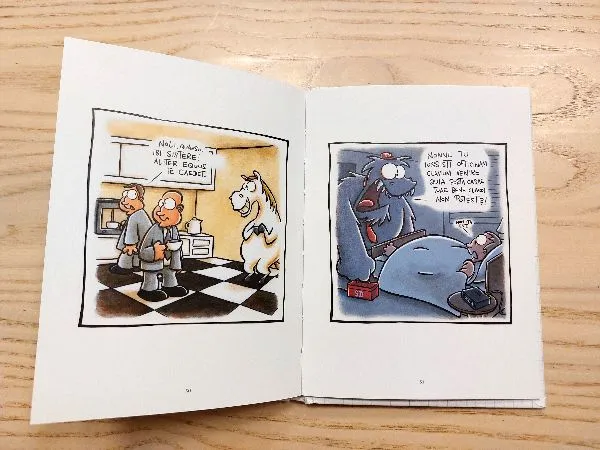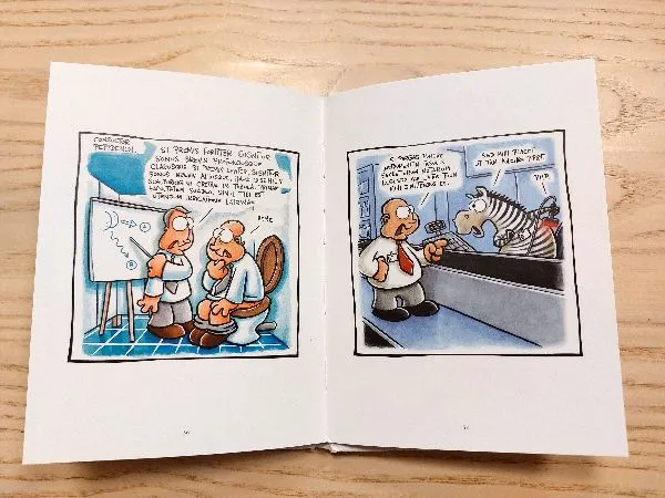 Karikatūros lotynų kalba. Knygos gale pateikti vertimai į vokiečių kalbą.